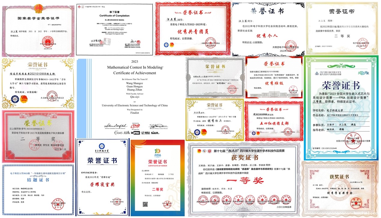【人物简介】汪上策,中共党员,信息与通信工程学院通信工程专业2021级本科生,专业均分94.1,专业排名1/204,GPA4.0。获得国家奖学金两次、2023年美国大学生数学建模比赛Finalist奖(特等奖提名奖)、全国大学生嵌入式芯片与系统设计竞赛FPGA创新设计竞赛国家级三等奖、第十七届“挑战杯”四川省大学生课外学术科技作品竞赛一等奖等国家级省级奖项8次、校级各类奖项25次。曾参加“成电思源马克巴-启梦计划”第四期暑假日本早稻田大学交流营并获评优秀团队。曾在第28届国际光纤传感大会发表论文一篇,已有在审专利一项,并将于今年4月参加第45届光子与电磁学研究国际研讨会,进行口头汇报。现任信息与通信工程学院2023010911班导生,学院学生发展指导中心朋辈帮咨询师等。