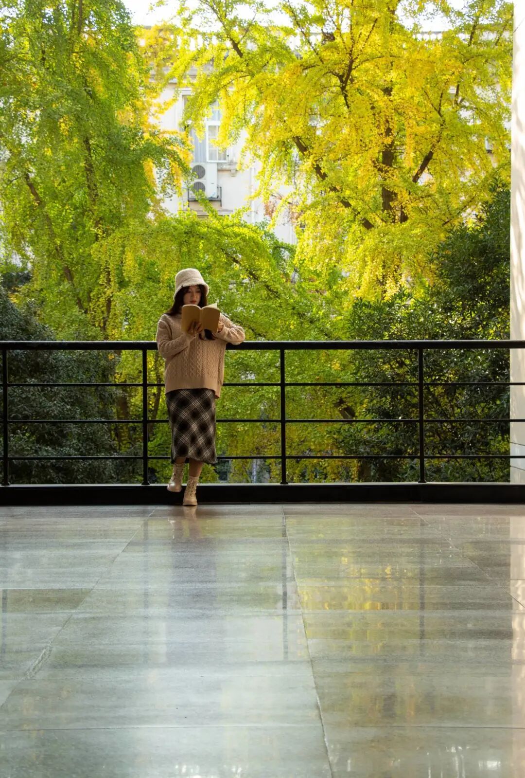 连廊外片片金辉点缀枝头
