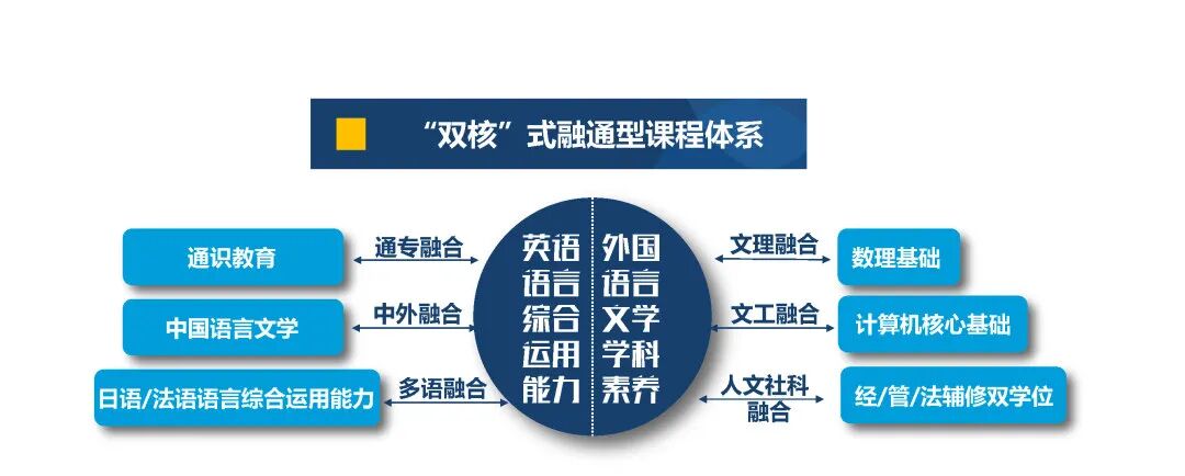 紧跟国家发展和时代需求,以外国语言文学学科素养为核心,融合学校电子信息优势,具有鲜明的跨语言、跨文化、文理工交叉特征,培养学生具备较强的研究性学习能力、跨文化沟通和国际传播能力、全球胜任力以及电子信息和计算科学素养,体现出复合型精英人才优势。