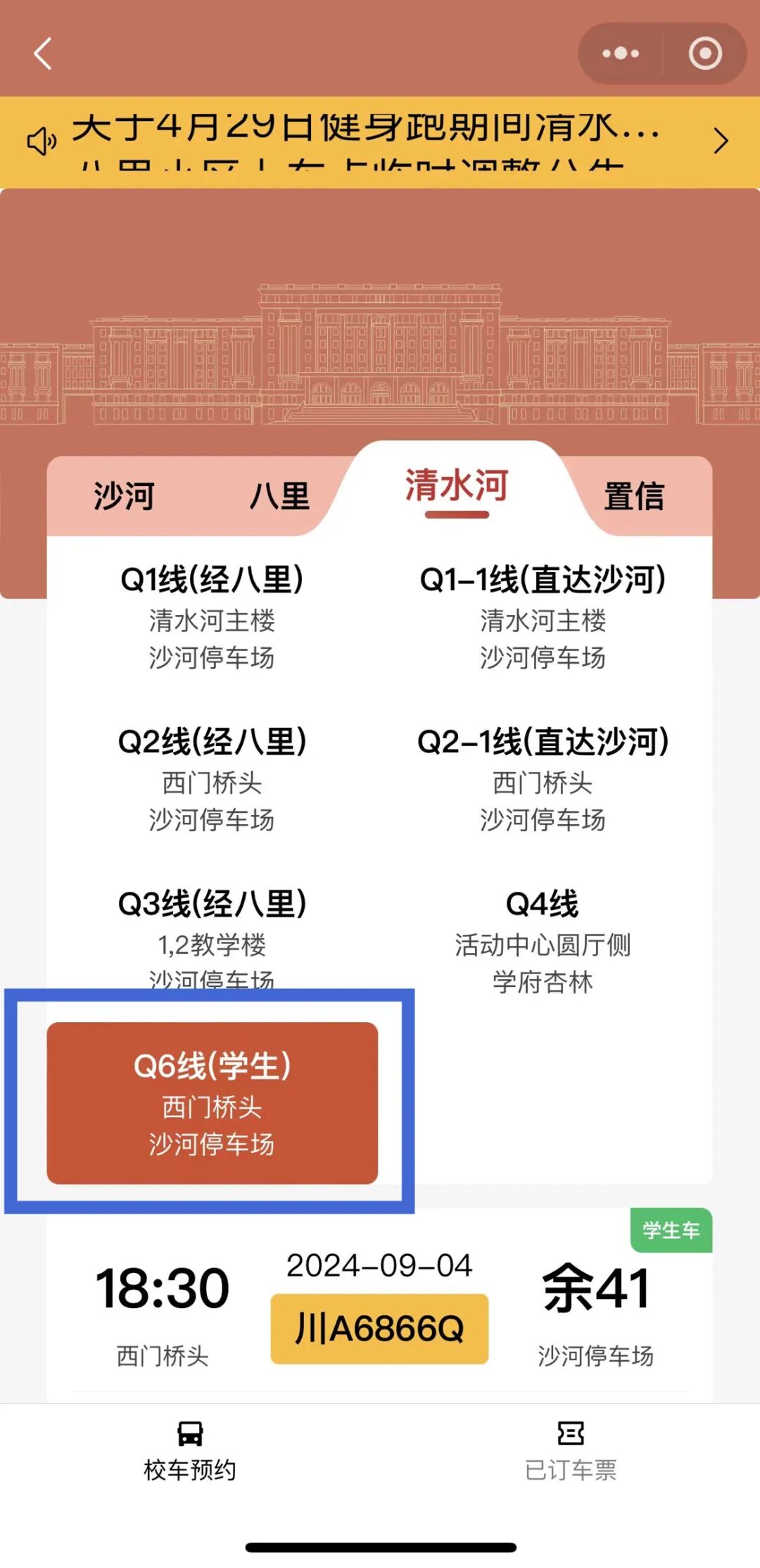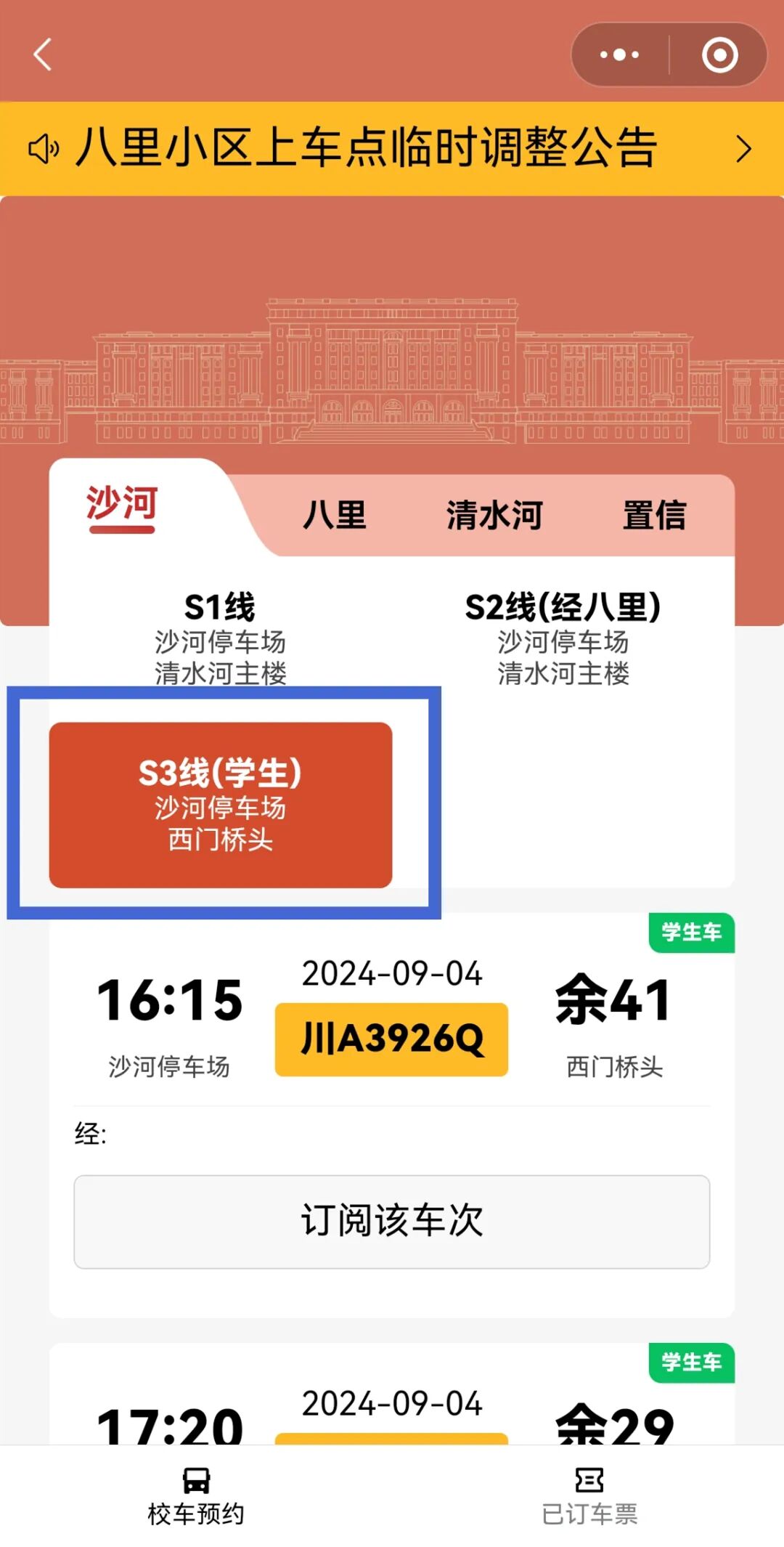 点击蓝色框区域,选择路线含“学生”即可预约乘坐。