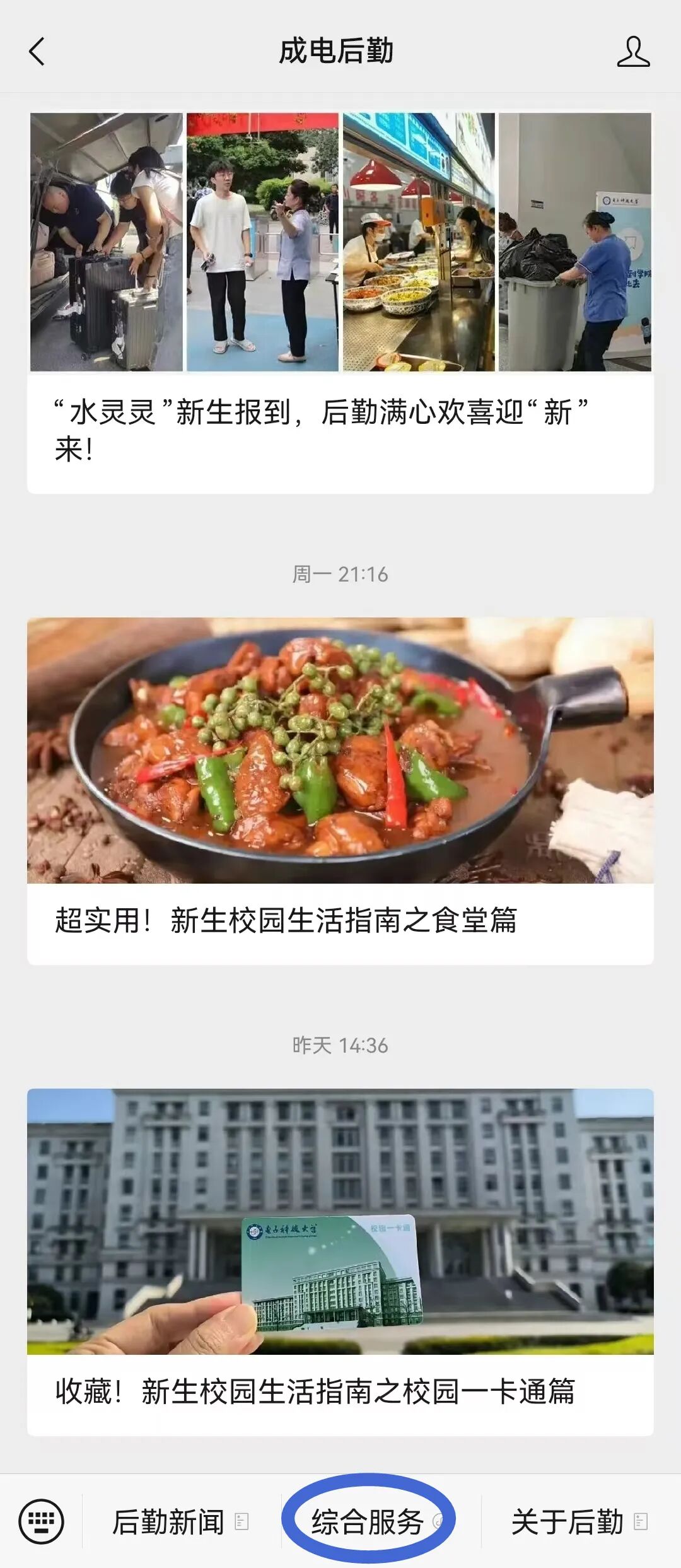2.关注“成电后勤”微信公众号,点击“综合服务”,即可进行分类预约、查看时刻表哟~