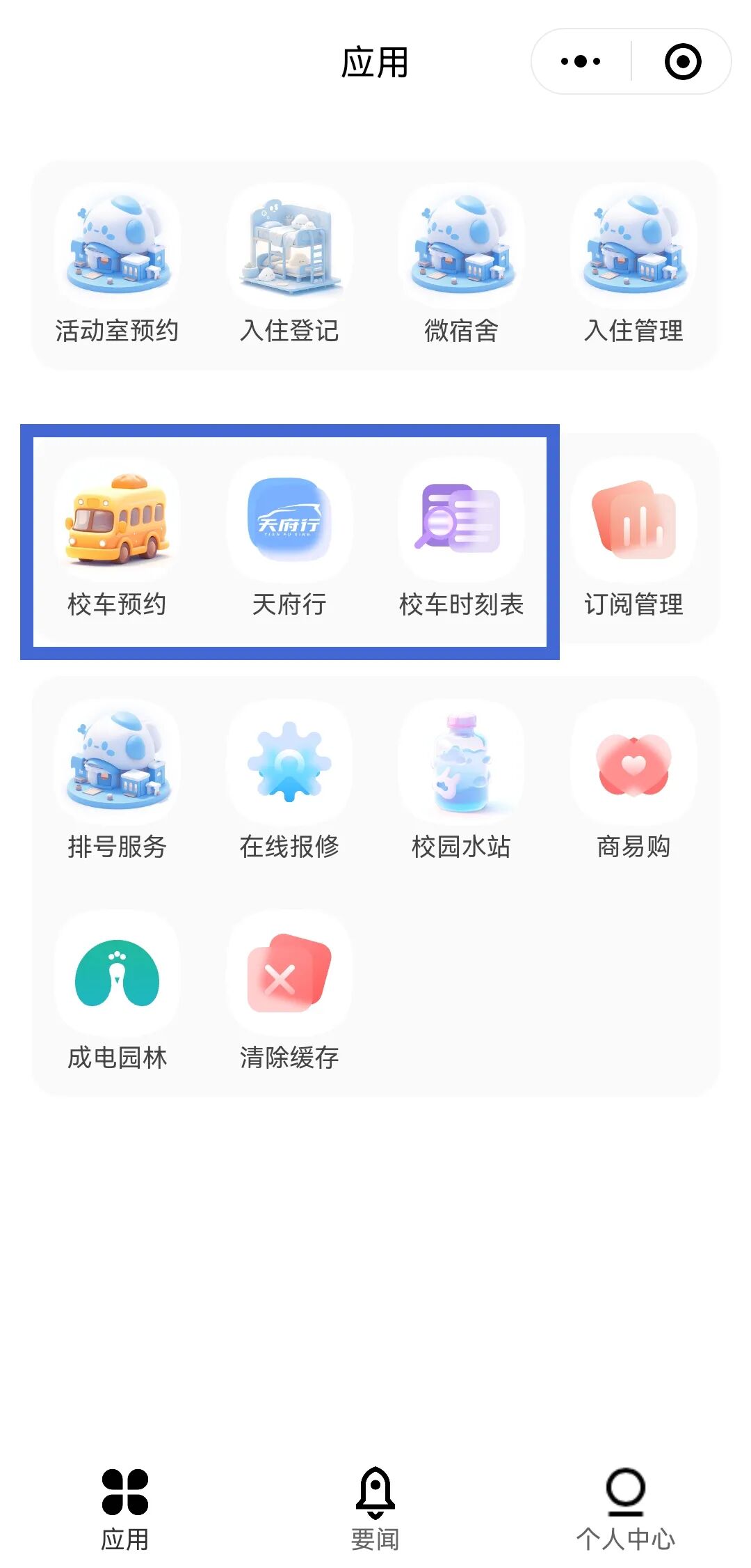 1.我电有“天府行”“校车预约”2类学生班车,为清水河校区、沙河校区往返线路,均实行微信预约乘车。
