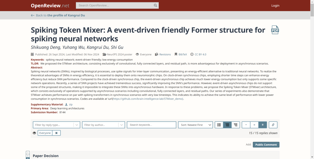 最终,杜康睿以第三作者身份在NeurIPS 2024上发表论文《Spiking Token Mixer: A event-driven friendly Former structure for spiking neural networks》;其关注脉冲神经网络时间可变性的相关一作论文,在ICLR2025(机器学习领域三大顶会之一)接受专家审阅。